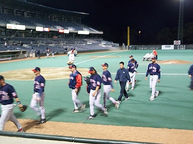 続いてポータケットの投手サム・リー。一昨年まで中日にいたサムソンである。彼もまた、昨年はメジャーに定着できず、今年も3A暮らしとなっている。しかし今日は、同じ韓国人である先発のチョから中継ぎをはさんで9回裏に登場してきた。登板していきなり3ボールとなり場内がどよめくが、この回を無得点におさえて今季初セーブとなった。内容としては、ストレートが決まったときはさすがと思わせるものがあり、あとは若干悪いコントロールが課題か。先発のチョも担ぎ上げる投法だがなかなかの好投で、投手の良いボストンの3Aでなかったら、と思わせた。と同時にボストンでローテーションを守る大家は本当に大したものである(と思ったが結局しばらくしてポータケットに逆戻り)。(左の写真の左から4人目がサムソン)