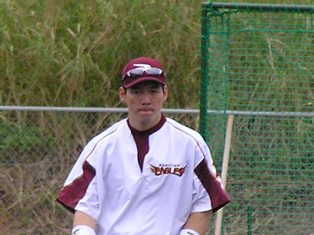 まずはお隣のオーナーゾッコンの佐竹を探すこととする。練習を開始しようと球場のレフト周辺に三々五々集まっている選手の中に彼を見つけた。しかし、他の選は数人で集まって談笑をしているにもかかわらず、フェンス際に一人ぽつんといる。そしておもむろにフェンスに向かってストレッチを開始していると、少年野球選手が寄っていった。佐竹は、「キミたちは誰を応援しに来たの?岩隈か?」と少年に聞くが、彼らは黙ったまま、それだけで会話が終わってしまった。慣れた子だと「佐竹選手!」という答えも期待できようが、全くすれてない少年たちなのでそれもなく、佐竹も会話をつなげようという性格でもなさそうなので、それもやむなしか。ここで「こういうときは佐竹選手と言え!」という指導をしてしまうと、見知らぬおっさんに変なことを言われたと必要以上に警戒されそうな雰囲気もあり、佐竹もそれで笑ってくれそうもないので、やめておいた。