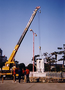セレモニーの最初は阪急ブレーブスこども会30年記念碑の下に眠るタイムカプセルの開封であった。これは、1979年の7月に埋めたとのことで、当時会員であったアーサー凹氏(以下凹)の作文が入っているのではないかということに期待が集まる。碑には白い布がタスキがけされており、若干物悲しい雰囲気がある。宮司さんのお祓いのあと、その碑がクレーンで持ち上げられ、カプセルがドリルでこじ開けられた、すると、中に入っていたのは当時の子供会名簿と当時の阪急グッズの数々であり、残念ながら凹の渾身?の作文はなさそうである。なお、凹と同じく会員であった現スワローズの古田捕手よりコメントが寄せられ「こんなのがあるとは知りませんでした。」と思いっきりボケをかましてくれた(でもオープン戦で西宮球場で試合をしたのも思い出とも語っている)。