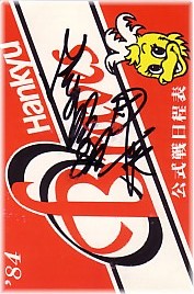 取材が終わり外に出てきた団長に、写真等をお願いすると半ば照れながらもOKして下さり、阪急ブレーブスの旗のもと、十数人の我々は代わる代わるシャッターを切りまくるという恐ろしい展開になってしまった。そんな中でも、団長もH帽を被って対応して下さった。写真の後はあつかましくサインをもらったりもしてしまった。こうして10分程度団長と色々コミュニケーションをしたあと、団長が「さぁ、いくでぇ」とあの懐かしの声を出して下さった。十何年ぶりかに聞くあの声は、全く変わっていなかった。オリックスになってからは表舞台に出なくなり、失礼ながら亡くなったという噂もあった今坂団長のあの声がまた聞けるとは、いやー、嬉しかったな!(右は団長のサイン。左は現在の団長(つねよさん提供)。