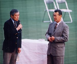 グランドではタイムカプセルの開封時にもいた宮司さんがお祓いをしていた。その後は球場の名場面紹介ということで、まずは阪急ブレーブス編。アストロビジョンの撤去後センター後方に登場した「オーロラビジョン(出野氏談)」に、小林一三翁の球場建設指令からリーグ優勝、日本一までの画像が一通り登場した。5分程度しかないのはやや物足りない気がしたが、画像の終了後は福本豊氏が登場しいろいろ思い出を語っていくことに。福本氏の話の中では、盗塁よりも守備に関する話が多く、「センターのフェンスから定位置まではちょうど16歩」「センターの守備だとイチローに勝っている」という非常にプロ意識の高い言葉が実に印象に残っている。また最後に、最大の思い出はという質問に対しては「オールスターでホームランをもぎ取ったプレー。あれで福本の名前を皆に知ってもらえるようになった」とのことである。私が熱心に見始めた頃は福本の守備はやや肩が衰えてきていたのだが、やはり盗塁の福本と並び『守備の福本』であったということを激しく痛感したところである(左は思い出を語る福本氏と聞き手の出野氏 つねよ氏提供)。