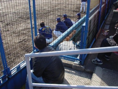 (以下の状況については、きむさんのHPをごらんください)。ちなみにきむさん提供の下の写真で黒いジャンパーを着たのが私なのですが、プルペン脇で試合を見る選手・コーチがこんなに近いのです。