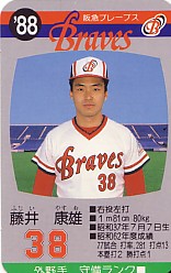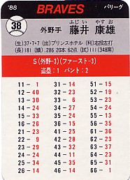 阪急時代唯一の写真入りカードと思われる。タカラカードは前年の実績を元にカードになる選手が決められる(ドラフト1位・新外国人以外)。康雄さんは、新人の87年の活躍振りが認められてのカード化。